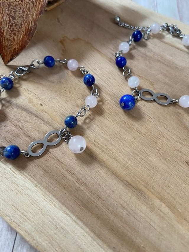 Le Bracelet 1 associe Lapis Lazuli et Quartz Rose, tandis que le Bracelet 2 inverse ces pierres, créant un parfait écho entre les deux bijoux.