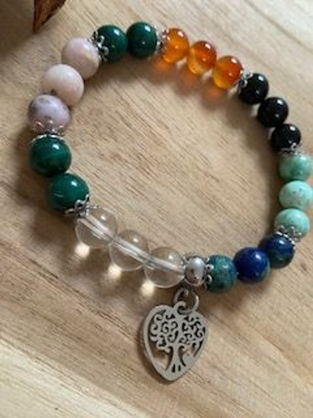 Il est composé de perles en pierres naturelles de 8 mm, choisies pour leurs énergies positives, et sublimé par une breloque symbolique au choix et des intercalaires en acier inoxydable, qui aident à vous guider et vous ancrer sur votre chemin de vie.